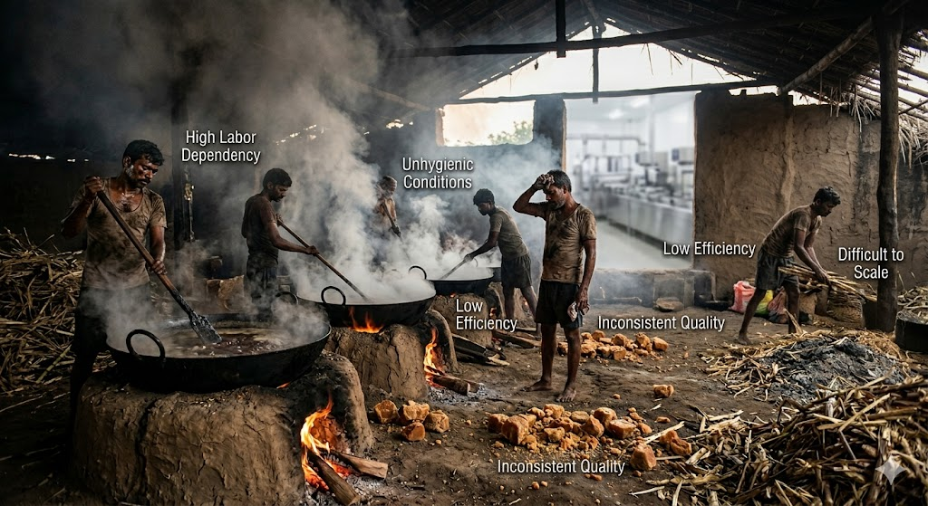 Traditional jaggery production has its strengths, especially in preserving authenticity. However, when it comes to scaling a business, it frequently creates constraints: